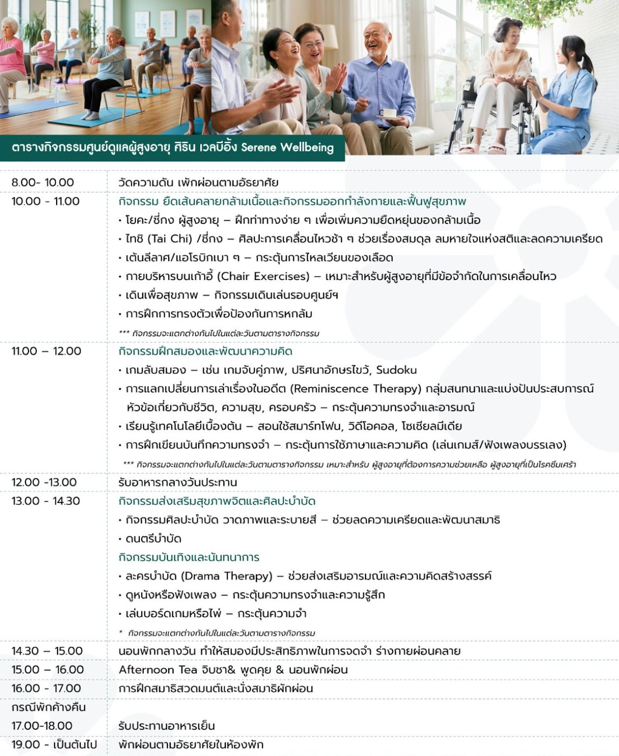 Serene Wellbeing ศูนย์ดูแลและฟื้นฟูผู้สูงอายุครบวงจร ให้บริการดูแลผู้สูงอายุที่ต้องการการดูแลอย่างใกล้ชิด ไม่ว่าจะเป็นผู้สูงอายุที่ต้องการเพื่อน พูดคุย สังคม หรือผู้สูงอายุที่มีปัญหาสุขภาพเฉพาะด้าน